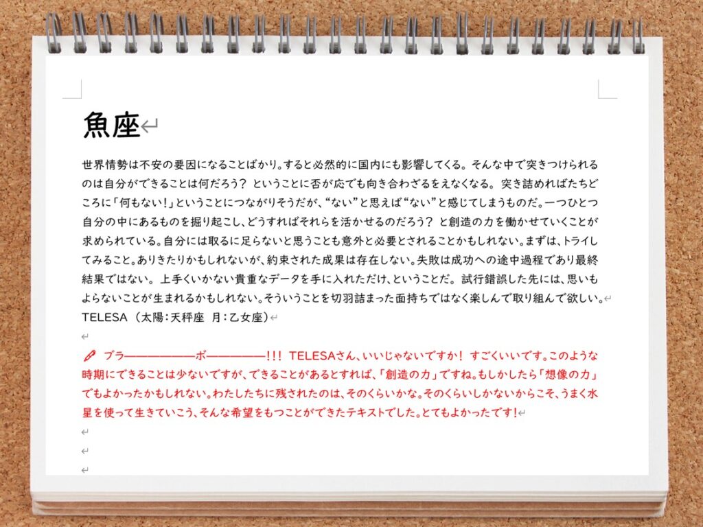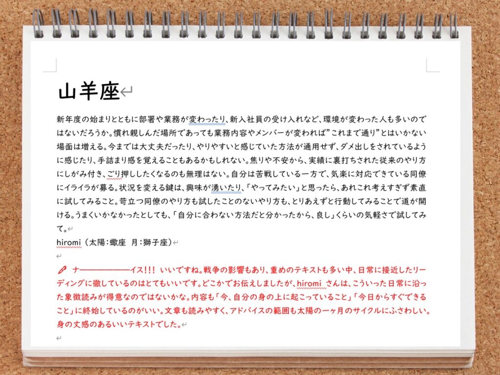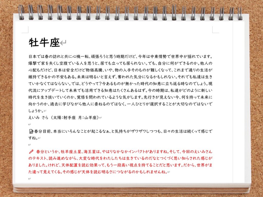 赤ペン12サイン占いも新しいサイクルのスタートを迎えてしまいました。今期も迷いながら進むしかない気がしています。未来予測が難しい時代に、トランジットをどう心の景として読むかに、引き続きチャレンジしていきたいと思っています。