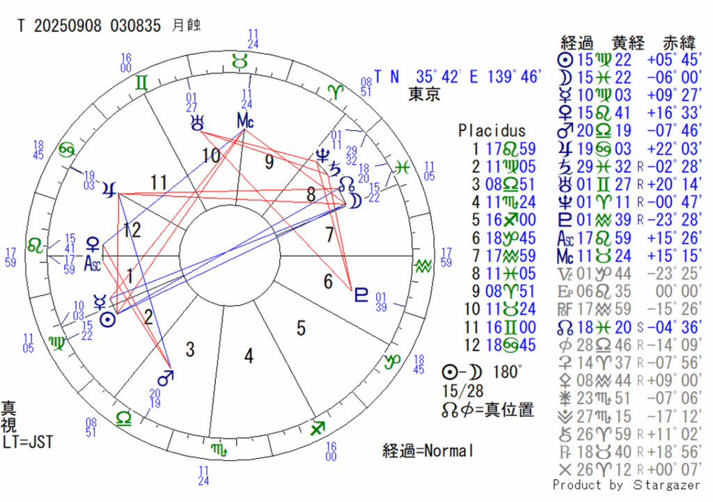 次に月食のチャート。この時、ネパールやフランスでは大規模な抗議デモが発生し、米国では暗殺事件、日本では石破首相の退任などが起きました。この月食図が直接的な原因になっているとは考えにくいですが、何らかのトリガーにはなっていそうです。